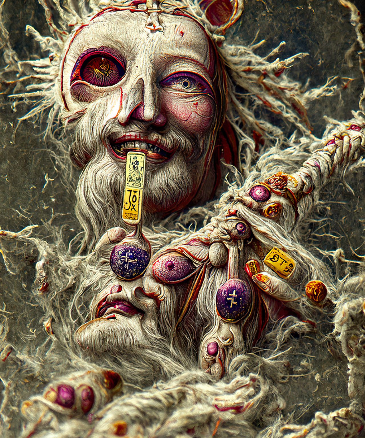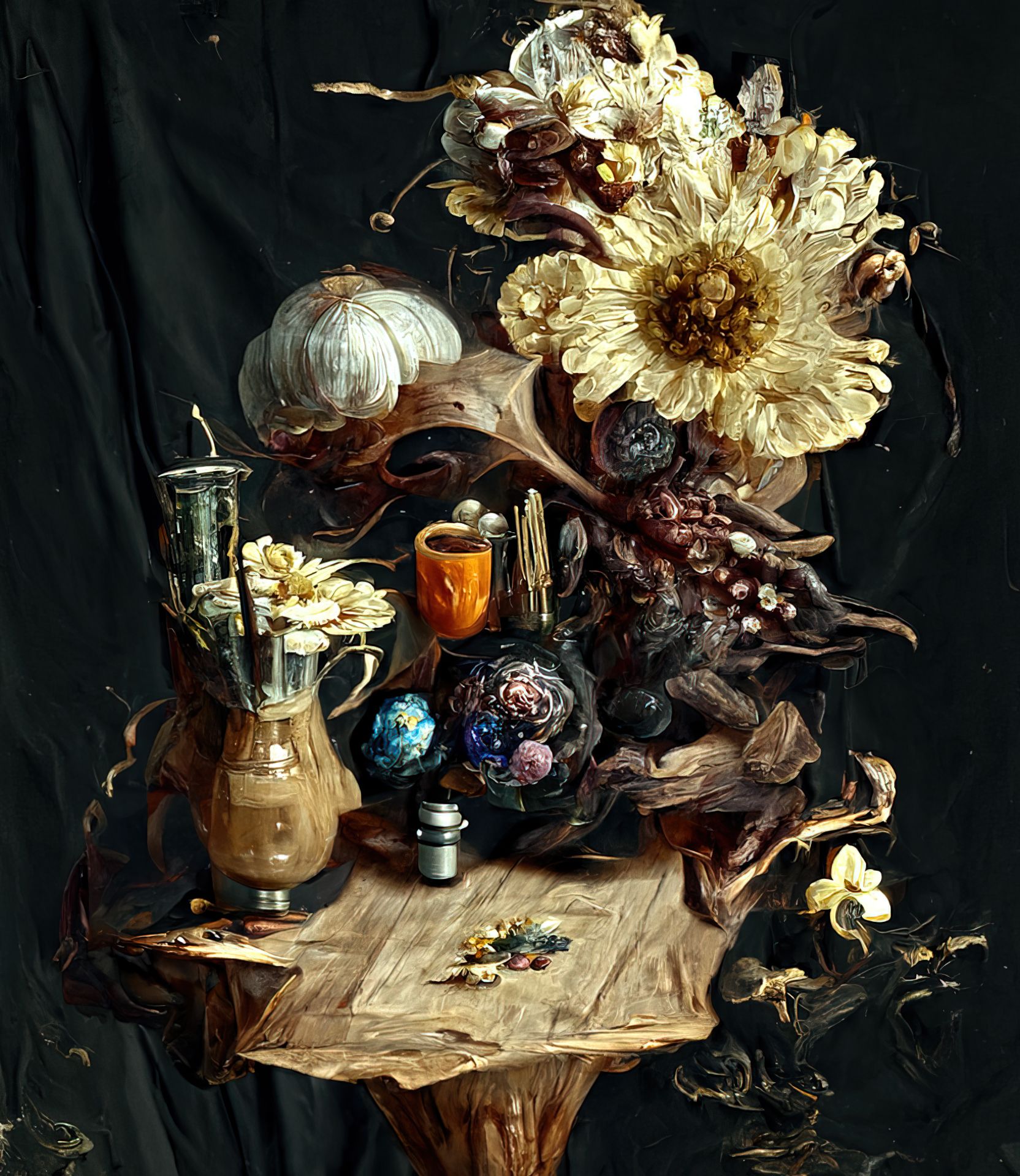 You may notice the number of iterations for each image; to get the results I had in mind, I had to fiddle around a lot with the parameters of the generation as well as the prompt formulation. Nth iteration means that this was the nth image generated from the same conceptual idea. If you are interested in the nitty gritty details, an example prompt can be found at the bottom of this page.